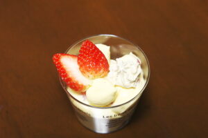 刻みイチゴをたっぷり入れたババロアとカレーパン。