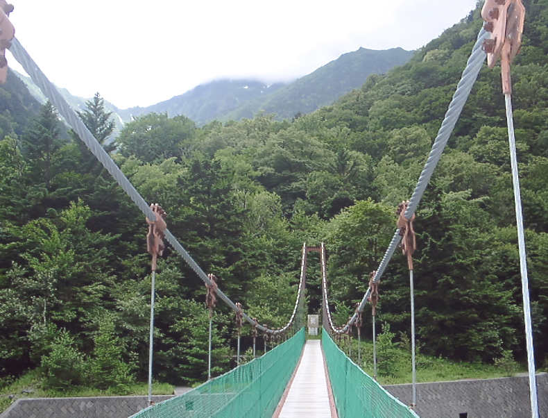 日本で二番目に高い山は、山梨県にある北岳だ。3193m。 7月の25日から27日にかけて行って来た。 タバコをやめて約半年、体調は悪くない。 (1日目) 八王子 7:29 − 8:27 甲府 (中央線・スーパーあずさ) 甲府 9:00 −11:06 広河原(山梨交通バス広河原行き 1900円) 南アルプス林道を走るバスからの景色がスゴい。黒部のV字谷よりも 切り立ったような山々が続く。先が思いやられる。 途中、夜叉神で休憩があり11:06ころ終点の広河原(ひろがわら) に着く。野呂川にかかる吊り橋を渡り、白根御池(しらねおいけ)小屋を 目指してひたすら歩く。この辺はまだ、そんなにキツくない。 北岳の山頂は雲にかくれていて見えない。