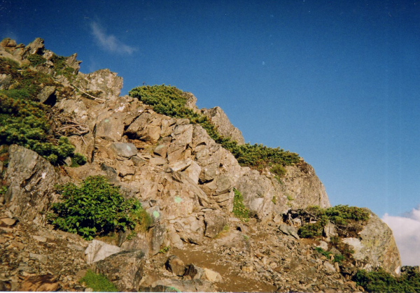 甲斐駒ガ岳は雲にかくれちゃったが、仙丈ガ岳がステキ。しばらく景色を楽しんだあと、岩場を慎重に下る。両手両足を使って、シリですべっておりる。 山小屋に着いてから、みんなに笑われたけど、いいのだ。 自分では満足したから。今回は、ビッグハイキングじゃなくて、まさに登山だった。さすがに第二位の高峰は立派だった。